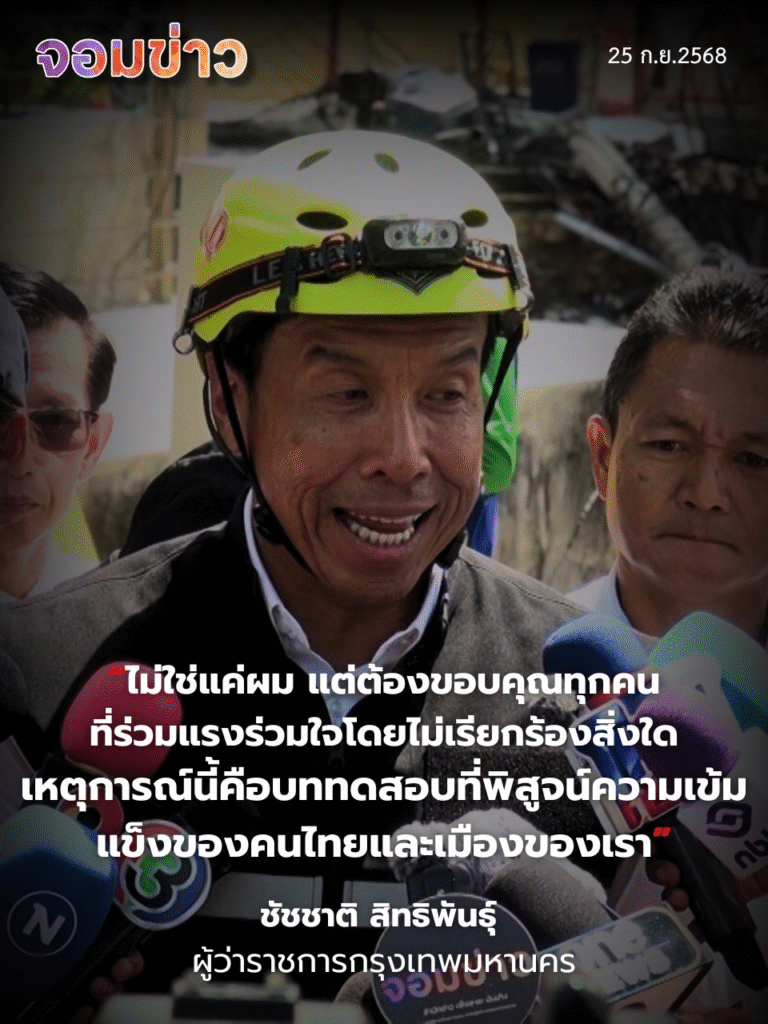 ผู้ว่าฯ ชัชชาติยังกล่าวเพิ่มเติมว่า เหตุการณ์นี้เป็นเหมือน “บททดสอบความแข็งแกร่งของเมือง” และพิสูจน์ให้เห็นชัดว่า คนไทยไม่เคยทอดทิ้งกัน การร่วมมือและน้ำใจคือพลังสำคัญที่จะทำให้กรุงเทพฯ และประเทศไทยก้าวผ่านทุกวิกฤติไปได้